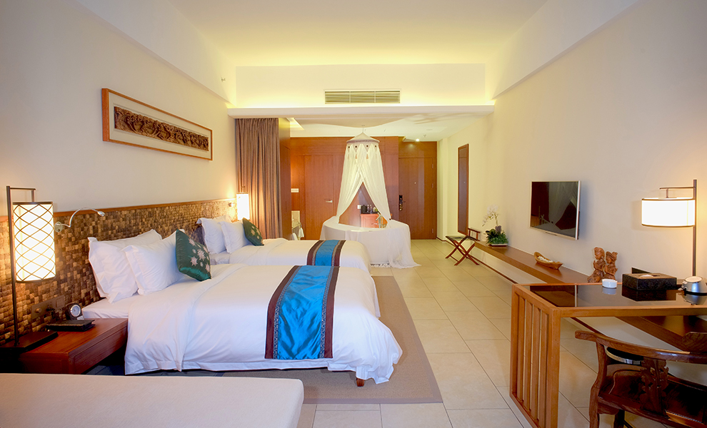 酒店设有各类标准房284间,有听涛大床房、无障碍大床房、高级海景大床房、超级海景大床房、豪庭双床房、复式家庭大床房、泳池大床房、无敌海景大床房、两间双床套房、海景两间双床套房、无敌海景大床套房、总统别墅。房间面向大海,临近美丽而舒适的沙滩,客房的装饰小品都来自巴厘岛的原生产品,房间精心布局、设计格调高雅、可免费使用WIFI等智能设备,让宾客尽享奢华惬意的滨海休闲度假体验。