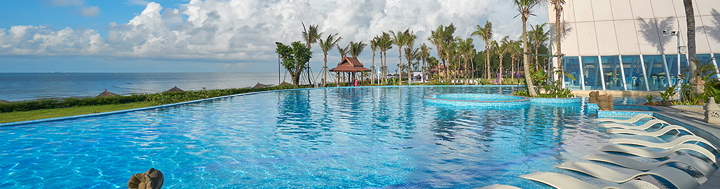酒店设计以东南亚风格为主,结合粤西滨海大气的风格和恢弘的气势与浓郁而醇美的东南亚园林的浪漫风情,共同演绎滨海度假典范。